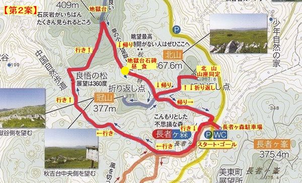行程は、長者ヶ森駐車場→長者ヶ森→良悟の松→地獄台→地獄台石碑(昼食・集合写真)→北山(山座同定)→長者ヶ森駐車場