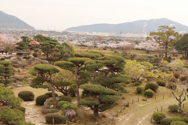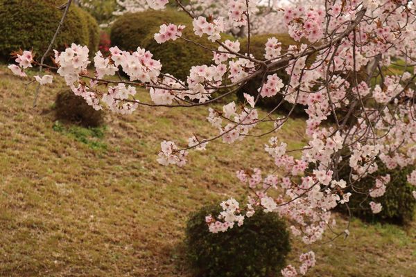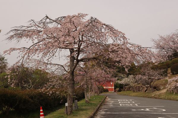 防府天満宮にあるソメイヨシノやシダレザクラは満開、オオヤマザクラは葉が大きくなりかけていました。春風楼からの桜並木や石灯籠の並び、眼下の防府の街並みは素晴らしい眺めでした。