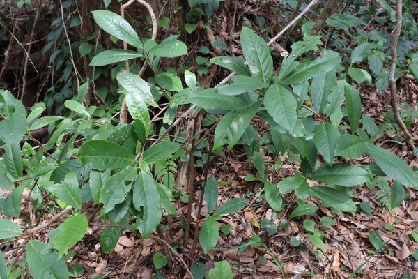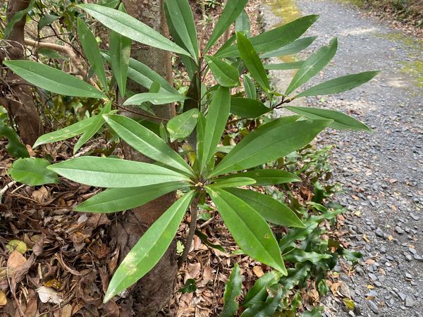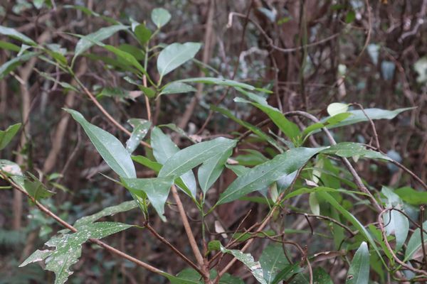 ホソバタブの葉はタブノキの葉とずいぶん形が違う様に思います。半分より先側が細くなり先端も細長くとがっています。 |