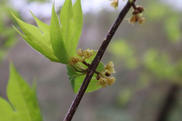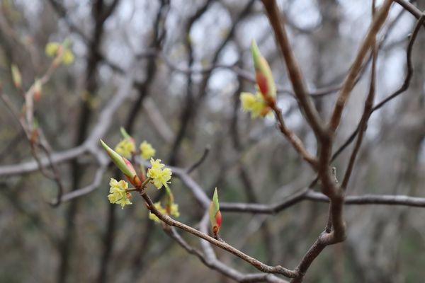 葉に切れ込みがあり給食のスプーンみたいなのでシロモジ。雄花 |