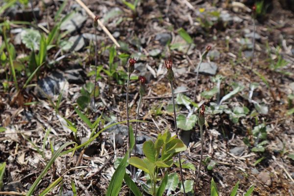 天候が不安定な週でしたが15日(木)は晴天に恵まれ、風も穏やかな絶好の観察日和でした。心配されたオキナグサを観察することができて、嬉しく思うとともにホッとしています。西の西山へのハイキングコースは思いのほか長くて急でしたが参加された皆さんに励まされて山頂に到達することができました。感謝申し上げます。ヒトリシズカ、オキナグサ、センボンヤリなどの目的の植物はややピークを過ぎている感じでした。今年の春の花の開花は全体的に早かったみたいですね。今回は記念写真は撮ることができましたが、観察や話しに夢中になりたくさんの植物の撮り忘れがありました。毎回のことですが、、反省