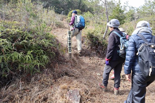 岩屋山山頂、みんなで楽しくお話ししながらの昼食です。この標識の前で集合写真を撮りました。 |